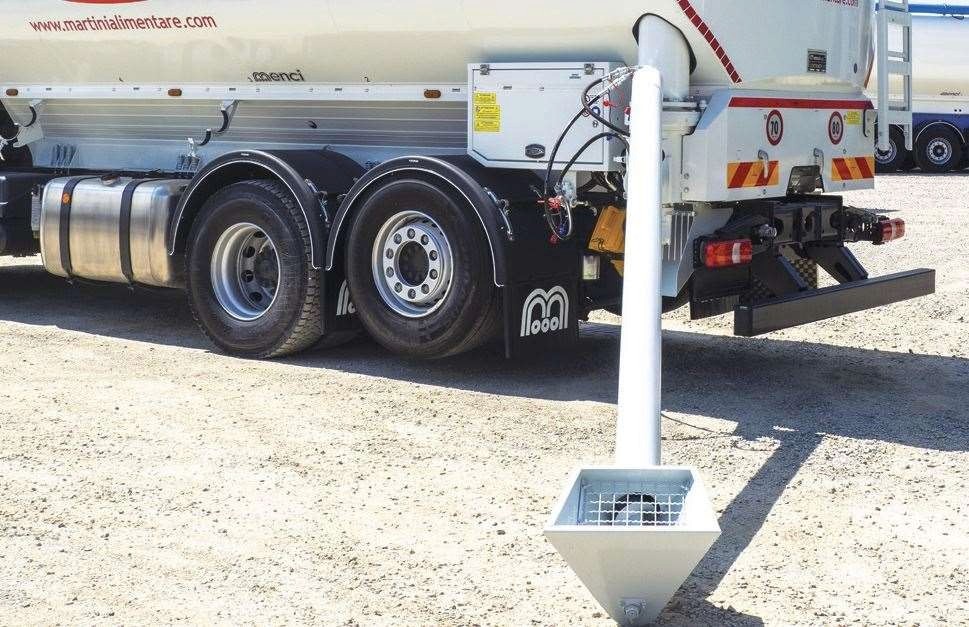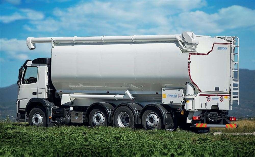 Semirimorchio cisterna per trasporto mangimi con sistemi di scarico avanzati (rotovalvola o coclea).